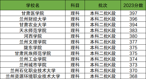 4、350到400分的大学有12所,分数较高的有甘肃医学院(397分)、兰州财经大学(396分)、甘肃农业大学(394分)、天水师范学院(383分)、河西学院(380分),完整列表如下: