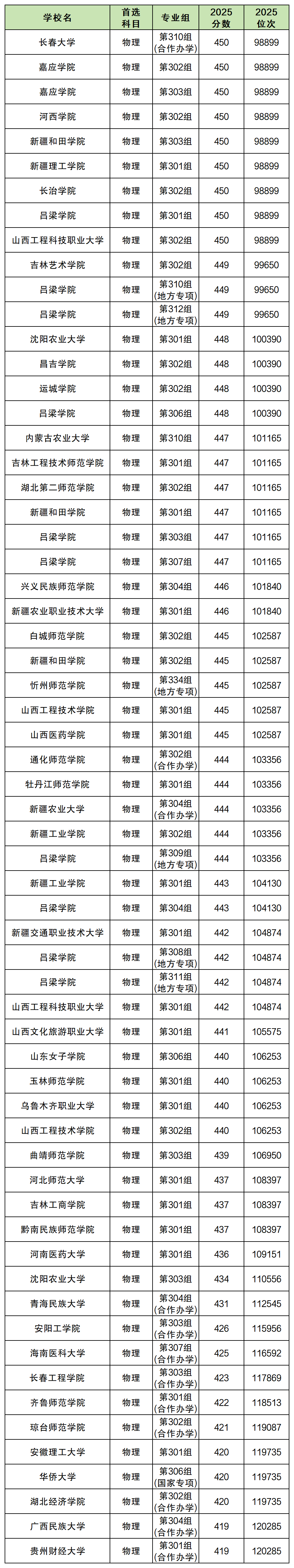 物理类410分到450分能上的公办二本大学对应位次最低是120285名。
