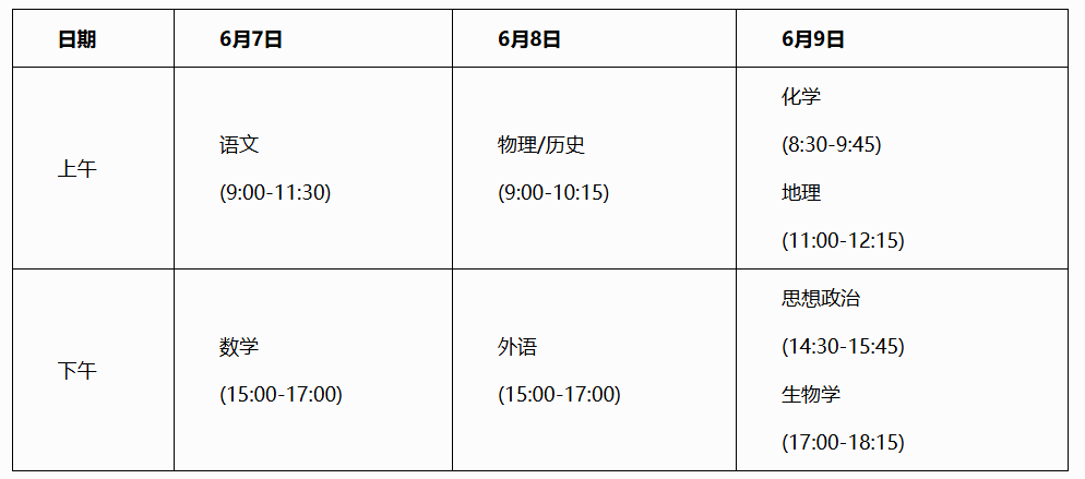 2025年广西高考采用“3+1+2”模式,除了语数外三科考试时间与全国统考时间一致,其余考试科目时间由各地省市自行安排,时间与2024年一致。具体高考科目时间安排表如下: