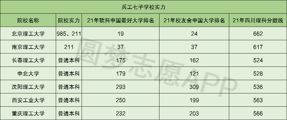 小编根据学校实力、排名、录取分数线以及学科建设整理出了兵工七子的综合实力。