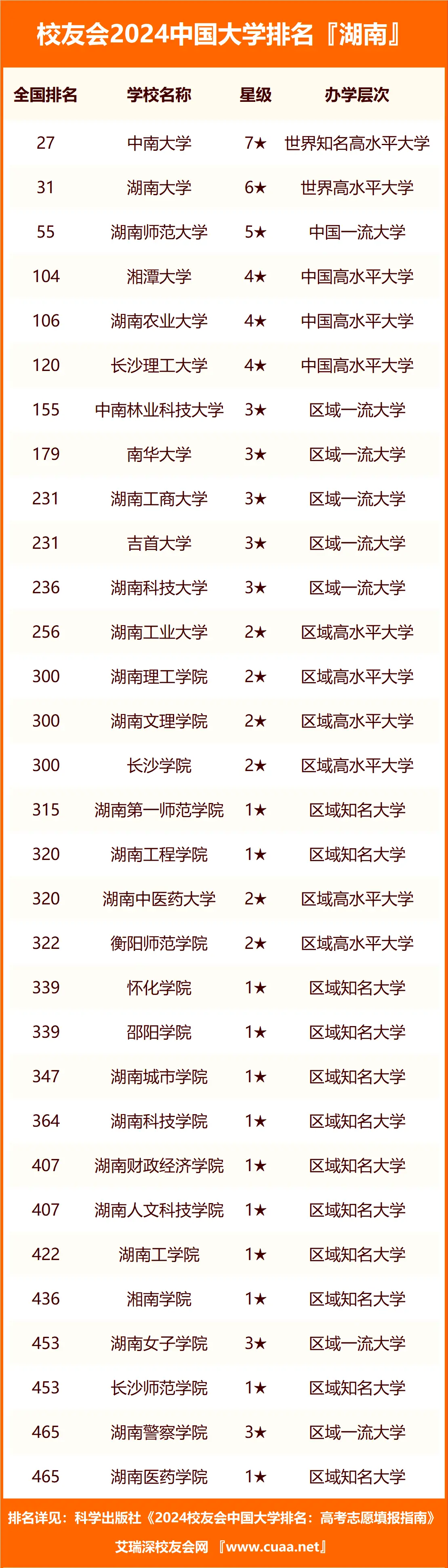 二、国内31所湖南的公办本科大学分数位次