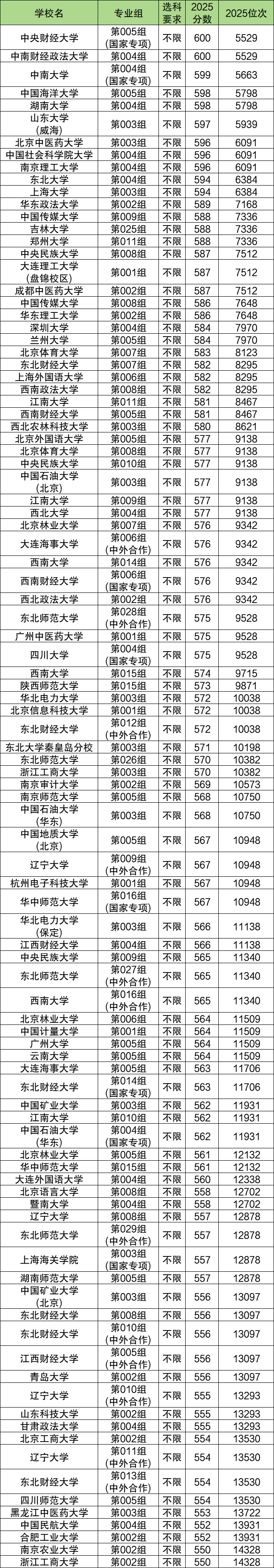 此类选科要求下550分到600分能上的大学中,分数线最高的有中央财经大学第005组(国家专项)、中南财经政法大学第004组,2025年最低分为600分,对应位次是5529名。分数线最低的是南京农业大学第002组和浙江工商大学第002组,2025年最低分550分,对应位次是14328名。