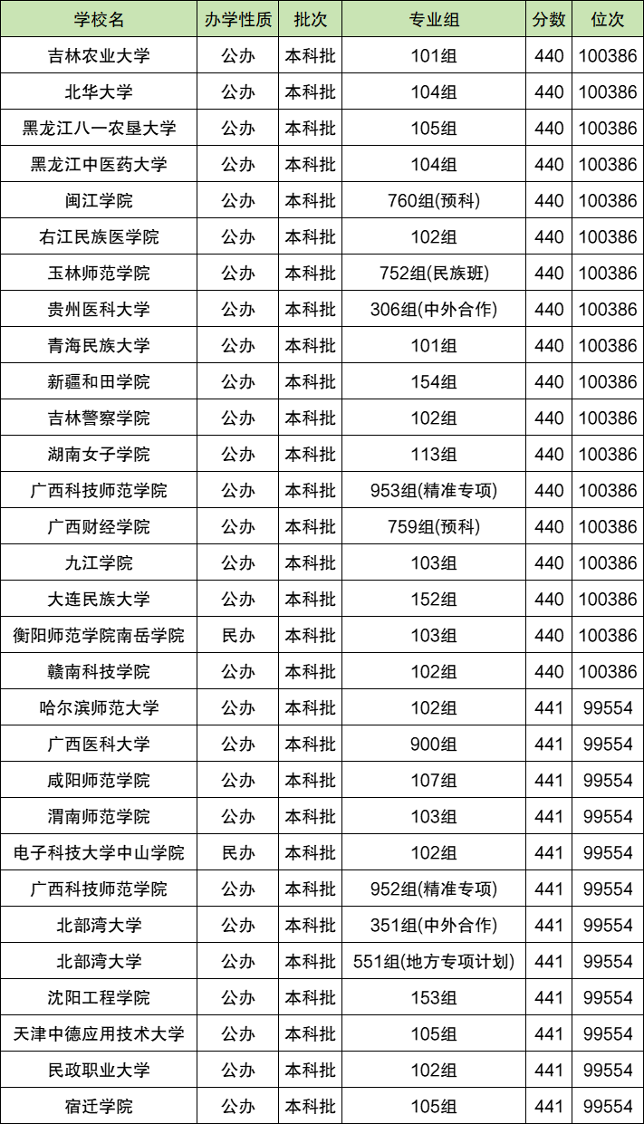 10万名左右最低位次对应的院校是吉林农业大学、北华大学、黑龙江八一农垦大学,最低录取位次为100386位,位次对应分数为440分。