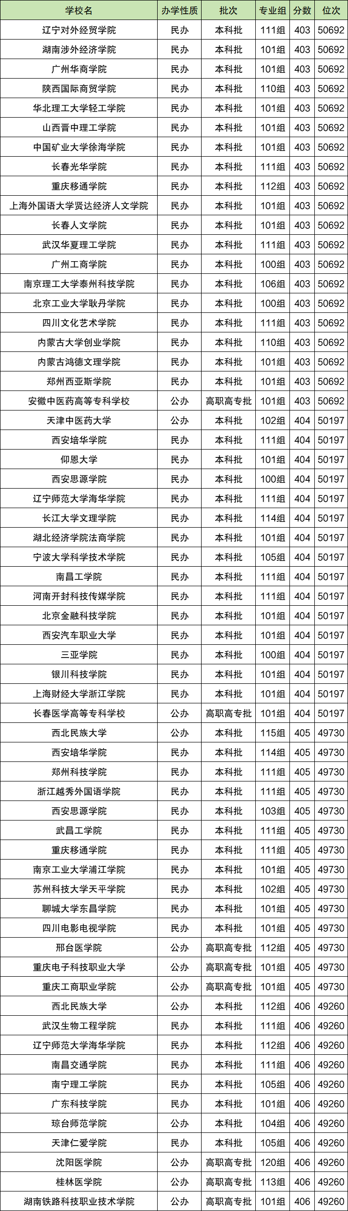 5万名左右最低位次对应的院校是辽宁对外经贸学院、湖南涉外经济学院、广州华商学院,最低录取位次为50692位,位次对应分数为403分。