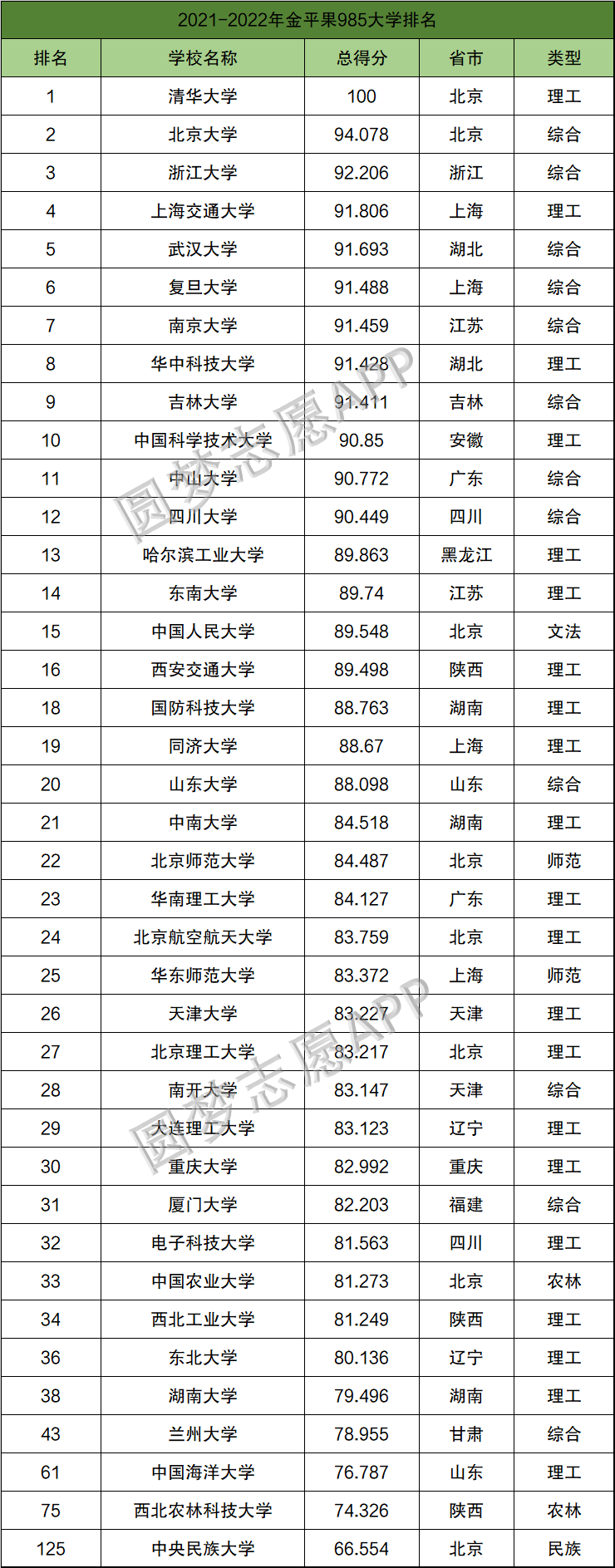 在金平果985工程大学排名中,清华大学、北京大学和浙江大学进入了全国前3强。在39所985高校中,共有35所大学进入了全国前40强,37所大学进入了全国前50强。以下为具体排名: