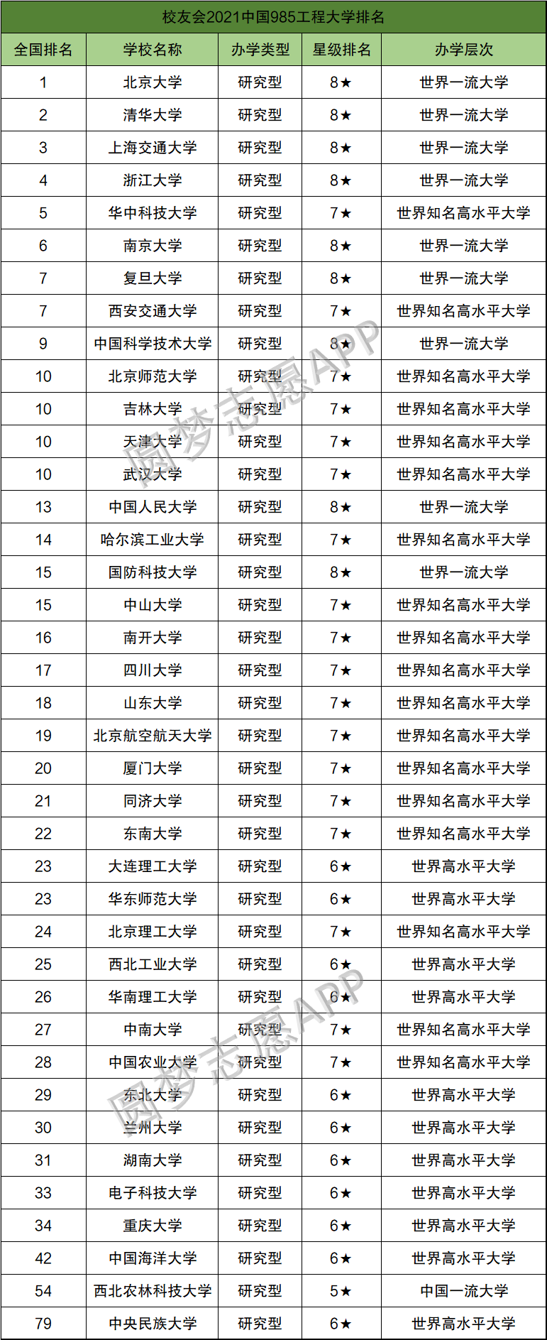 根据校友会2021年中国985工程大学排名来看,985全国前3强分别是北京大学、清华大学和上海交通大学。相比2020年,上海交通大学、中国海洋大学、西北农业大学的全国名次上升较快,浙江大学基本稳定。并且,2021年新排行榜还把国防科技大学纳入排名中,位居全国第15名。以下为具体排名: