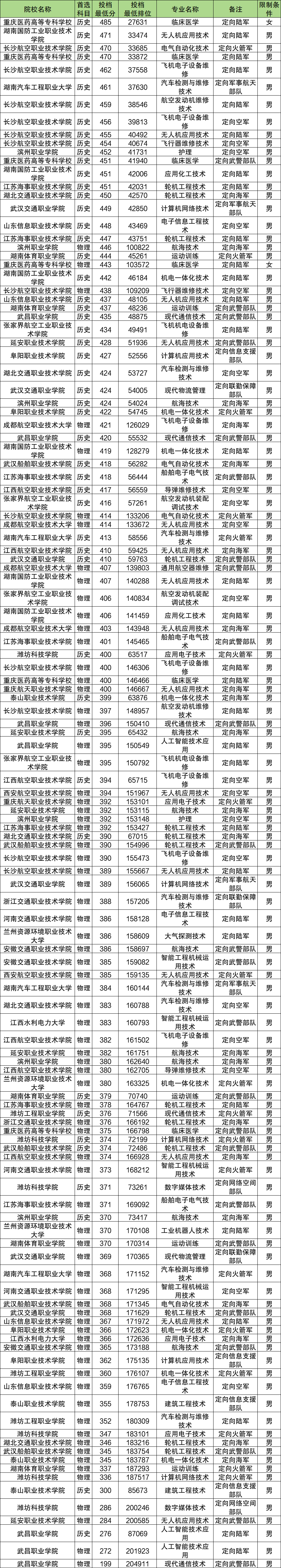 分数线排名靠前的还有:长沙航空职业技术学院电气自动化技术专业(历史)(定向火箭军)(470分)、重庆医药高等专科学校临床医学专业(历史)(定向陆军)(470分)、湖南汽车工程职业大学汽车检测与维修技术专业(历史)(定向军事航天部队)(461分)等。