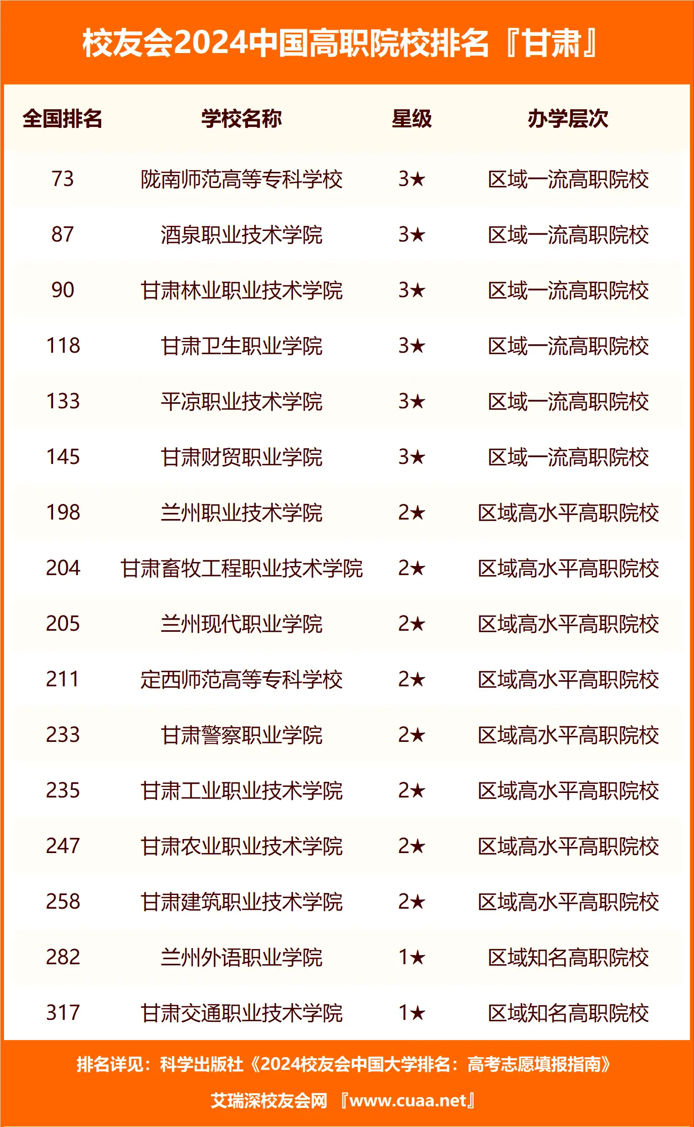 我们从校友会官方获取到了2024年全国高职专科院校的排名情况,同时我们为大家整理了2024年所有甘肃专科高职院校的排名数据如下: