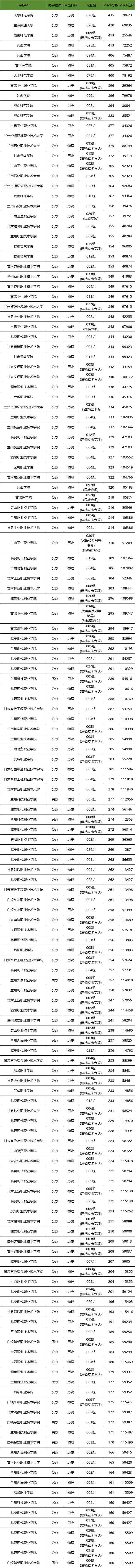 我们以甘肃高职大专在甘肃本省2024年招生的分数线为例,我们可以通过数据看看分数高、分数低的大专都有哪些。