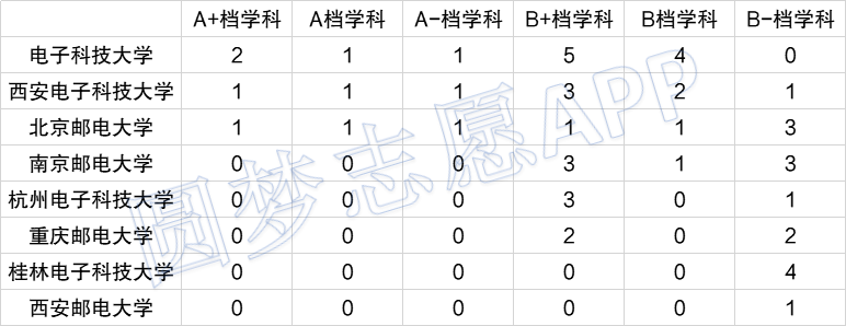 由以上排名不难看出,桂林电子科技大学、西安邮电大学,这两所高校拥有的A+至B-档的学科数目与质量要明显小于其它6所高校。
