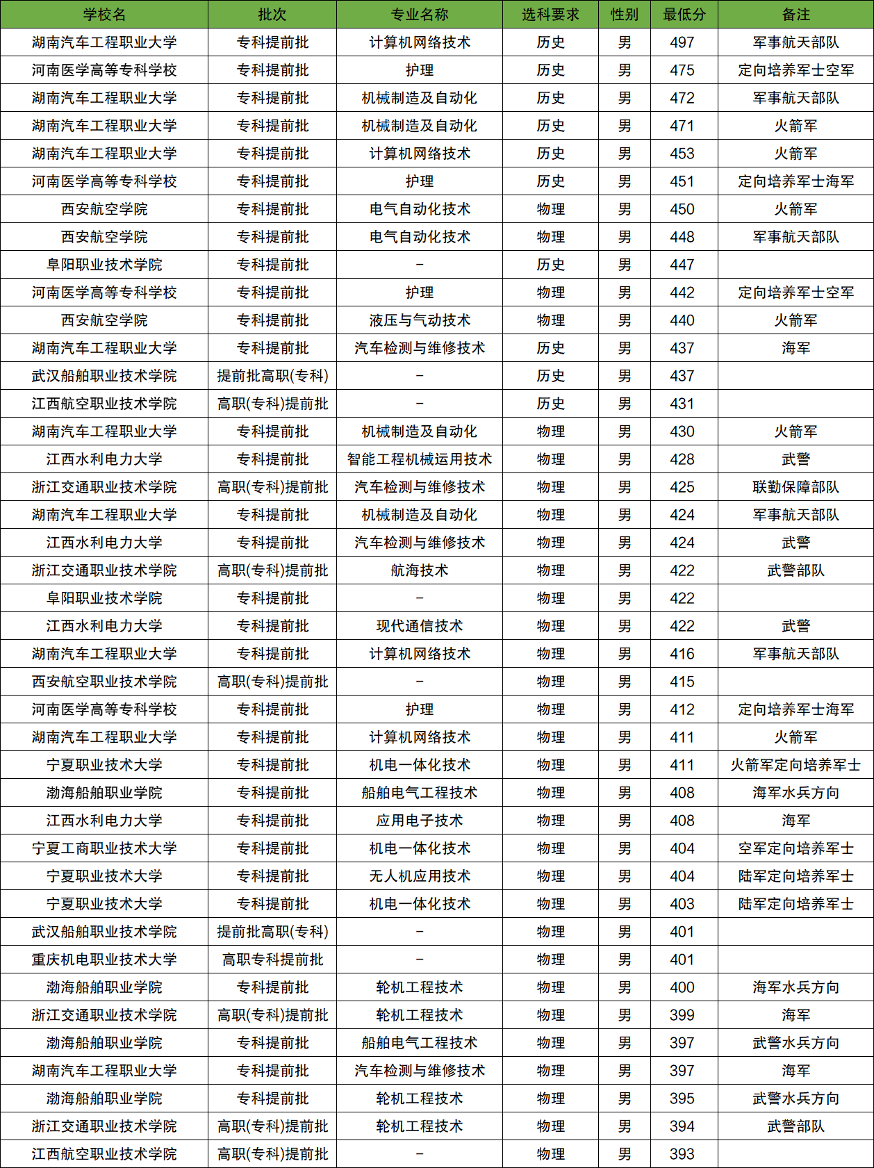 招生线最高的院校是湖南汽车工程职业大学,对应的分数是497分,此外分数在400以上的院校还有河南医学高等专科学校、河南医学高等专科学校、阜阳职业技术学院等。