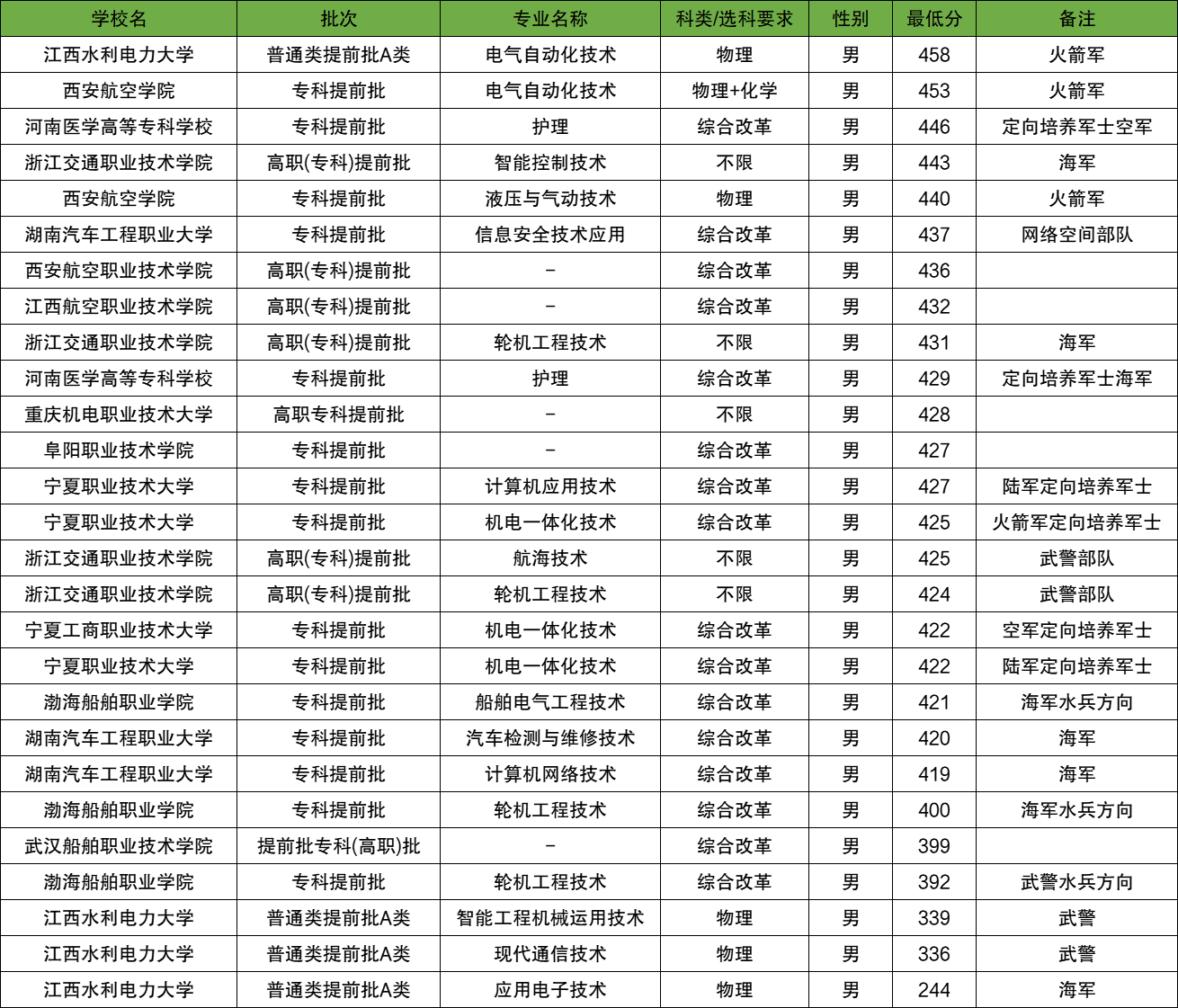 录取线最低的五个专业组分数在244-399分之间,包含江西水利电力大学(应用电子技术)、江西水利电力大学(现代通信技术)、江西水利电力大学(智能工程机械运用技术)、渤海船舶职业学院(轮机工程技术)、武汉船舶职业技术学院。