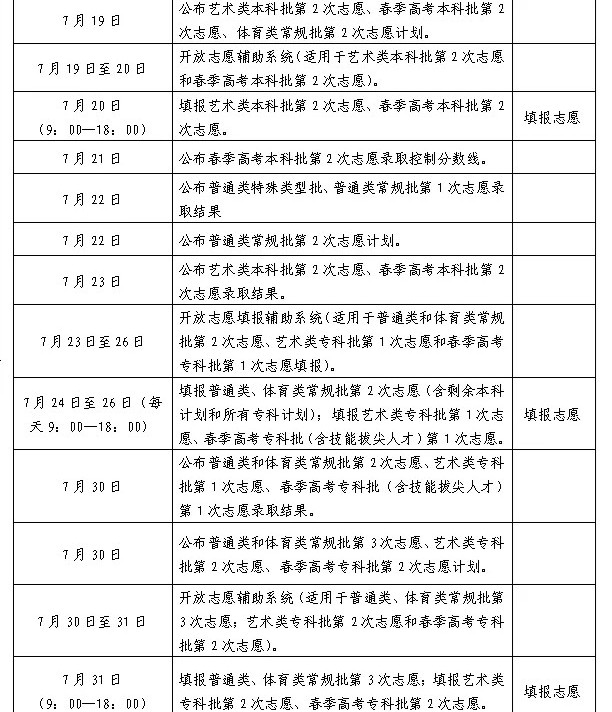 4)第二批本科(含地方专项计划、预科和定向):7月24日至7月31日。