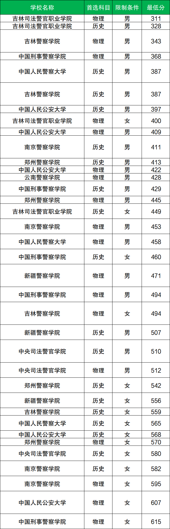 其中物理类男生分数至少在420分及以上、女生分数至少在522分及以上才有机会被录取。而物理类男生分数最低的院校是中央司法警官学院,物理类女生分数最低的院校是中央司法警官学院。