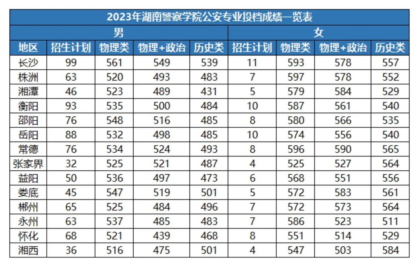 湖南警察学院的公安类专业(含公安学、公安技术专业)分数线是按各地市进行划分的,不同地市的考生报考湖南警察学院的分数线也有很大区别。