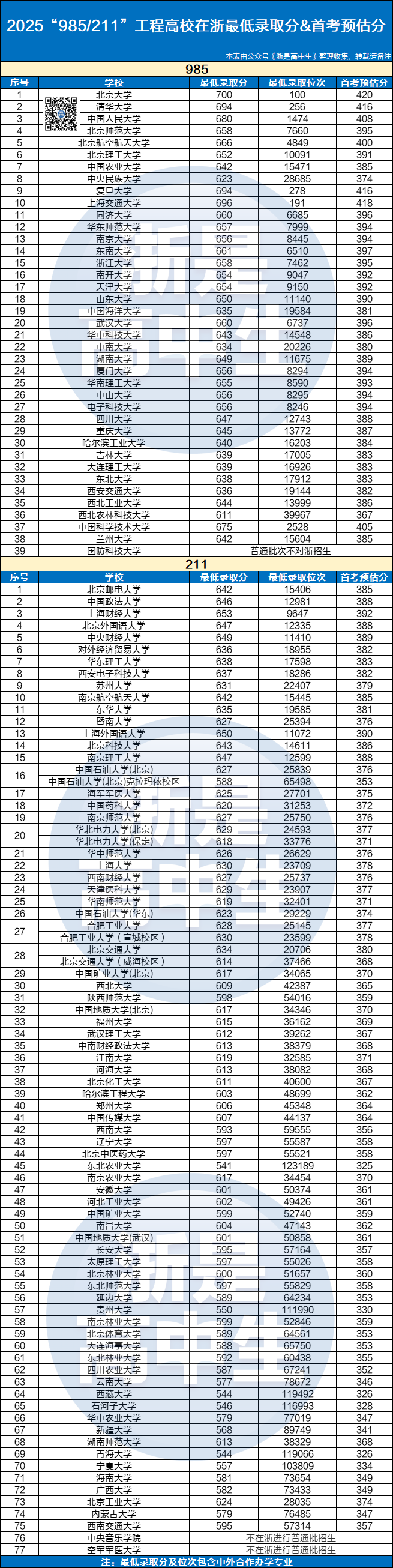 根据2025年浙江省的首考分数预估,以下是不同层次本科学校的最低录取分数线: