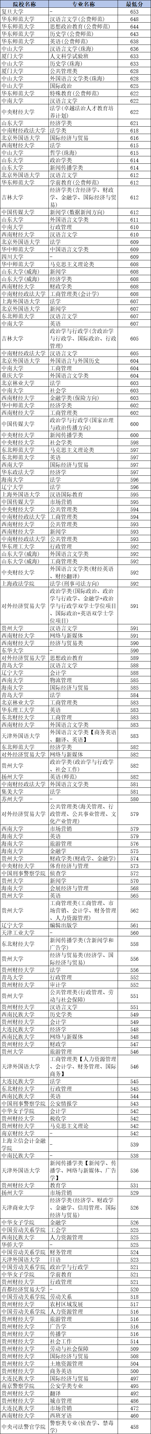 国家专项计划各个大学录取分数线(贵州历史类):
