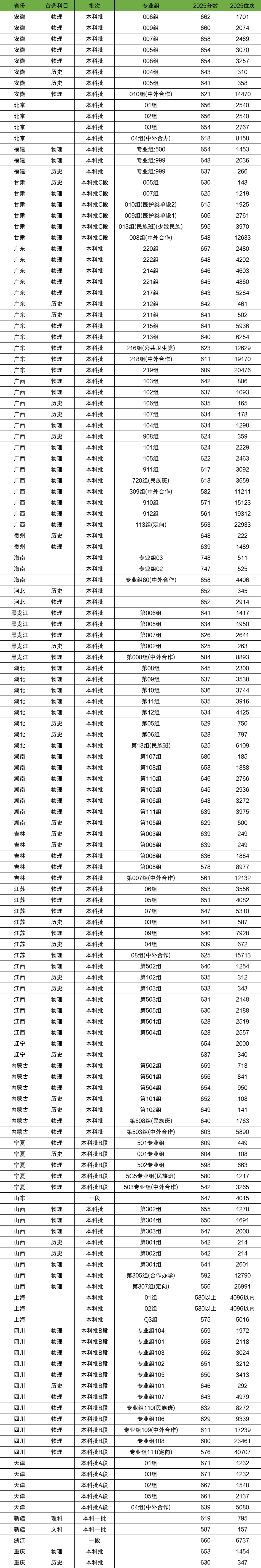 以下为2025年武汉大学本科批部分省份招生分数线。