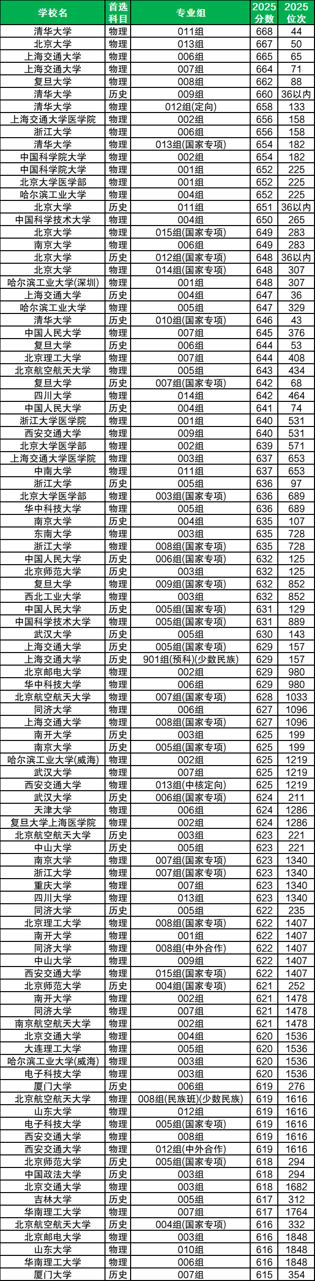 优先冲刺顶尖院校,如物理类位次44名的清华大学011组(668分)、历史类位次36名以内的北京大学011组(651分)。若分数接近清北线边缘,可考虑复旦大学金融、浙江大学计算机等王牌专业,避免被调剂至冷门专业。同时关注“强基计划”,适合对基础学科有强烈兴趣的考生,但需接受本硕博连读的绑定条件。