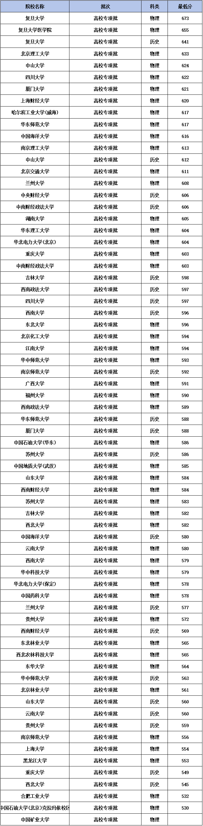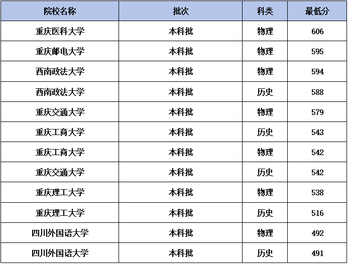 注:本文只整理出专项计划院校在重庆的招生最低分,不含专业组、具体专业分数线。