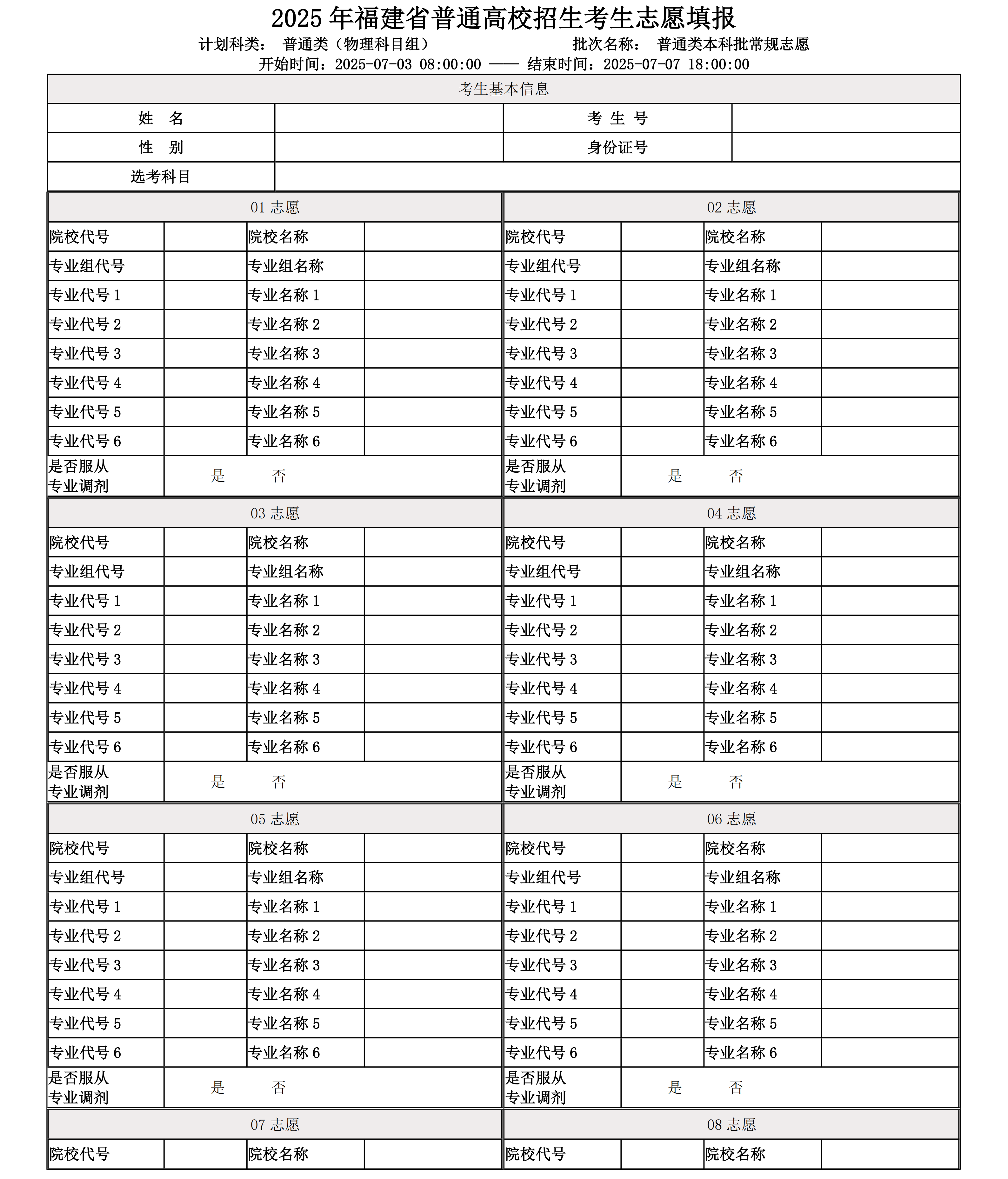 2025年福建本科批40个志愿样表模板图片如下: