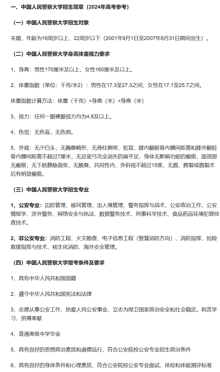 各警校的招生要求会有一些不同,具体要求要查看学校官网。小编为大家列举了中国人民公安大学2024年本科报考警察类专业的资格条件和相关要求,具体如下。