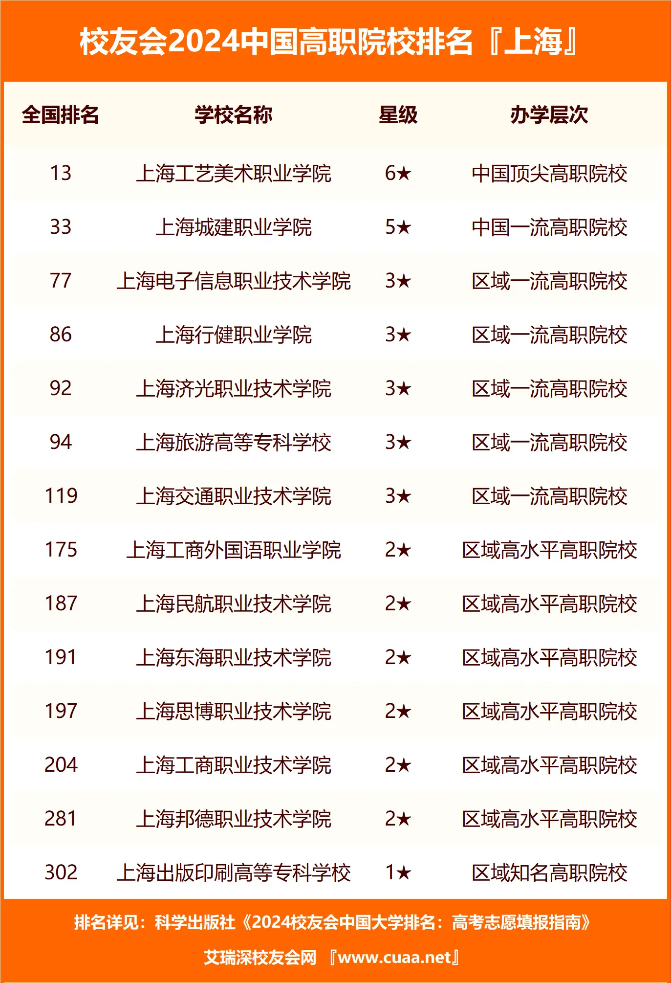 我们从校友会官方获取到了2024年全国高职专科院校的排名情况,同时我们为大家整理了2024年所有上海专科高职院校的排名数据如下: