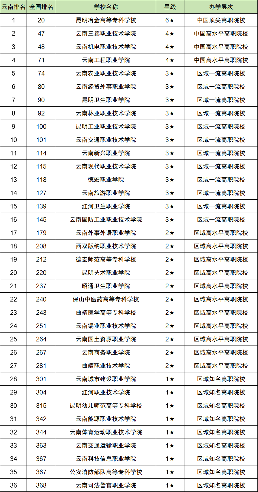 2025年云南公办专科学校排行榜由于榜单不同,具体排名也不同,本文以校友会2025年高职专科学校排行榜为例,整理出云南公办高职专科院校的排名情况。