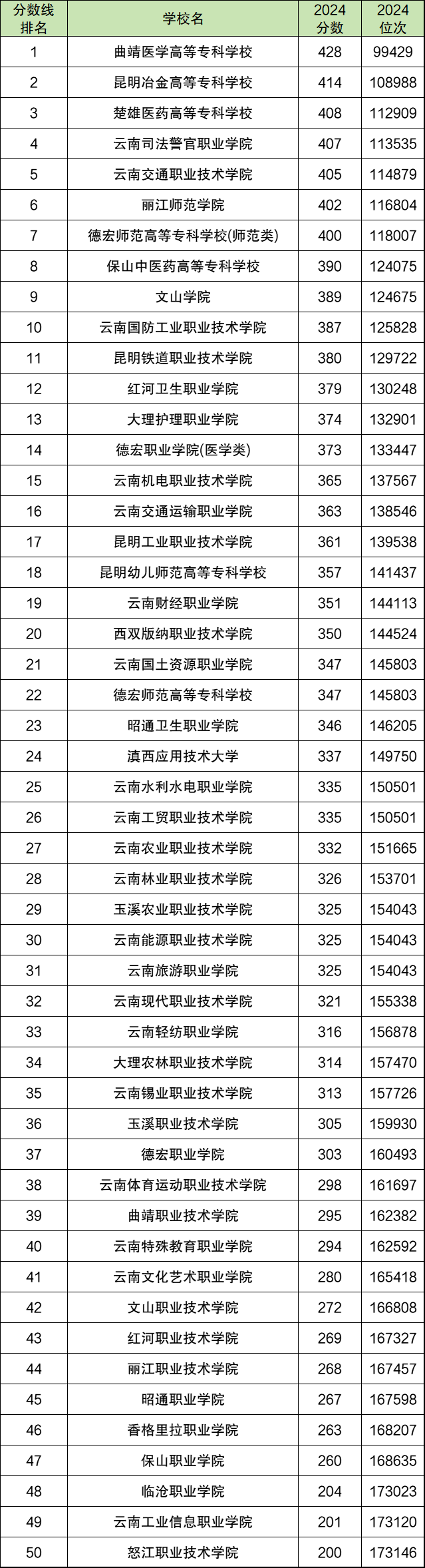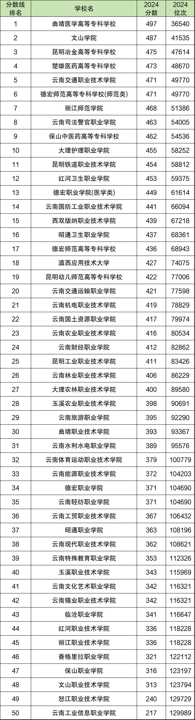 2024年云南公办专科大学在云南文科分数线排名前十为: