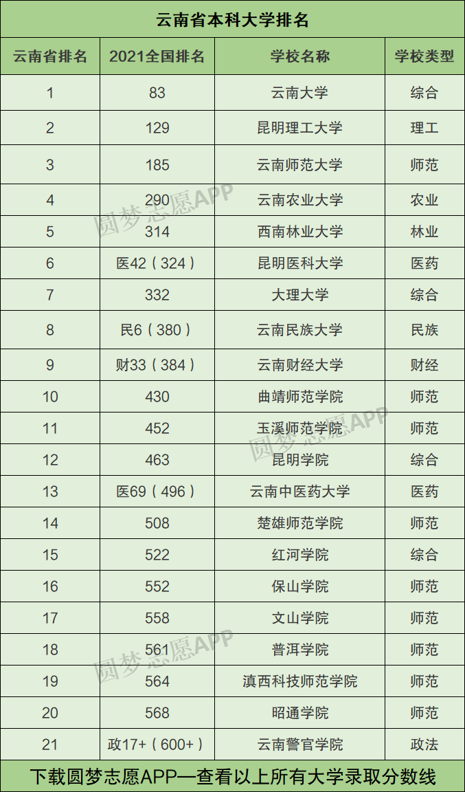 根据软科2021年中国大学前800强排名榜单可知,云南省内有21所本科大学进入全国大学前800强,这些大学均是云南省内乃至全国都比较强的大学。具体入选名单及排名如下图: