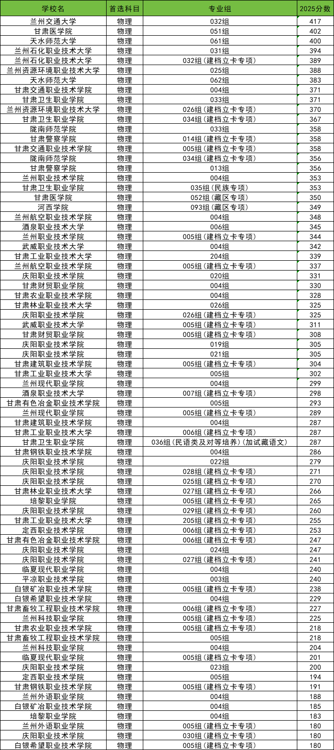 2025年甘肃省内各专科高校物理类录取分数线在180分-417分之间,录取分数线最高的大学是兰州交通大学032组,2025年投档最低分为417分,除此之外,甘肃医学院051组、天水师范大学061组,2025年投档最低分数线也在400分及以上。