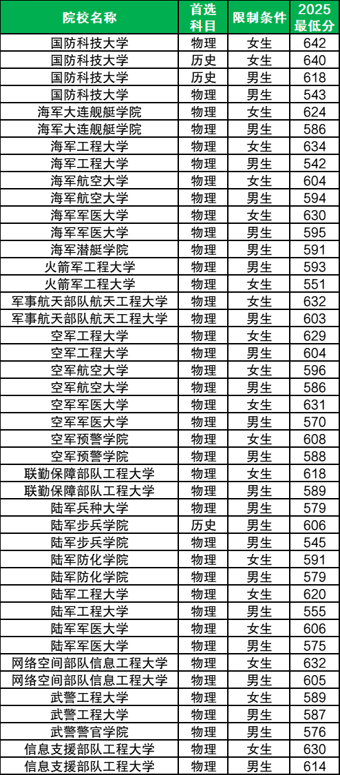 军校在各省的录取分数线有差异,本文以辽宁高考数据为例,展示全国22所军校2025年男女生最低录取分数详情: