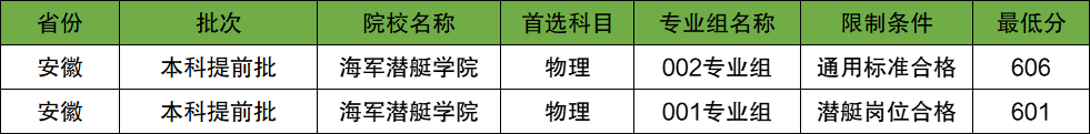 首选物理:001专业组最低分601分、002专业组最低分606分。