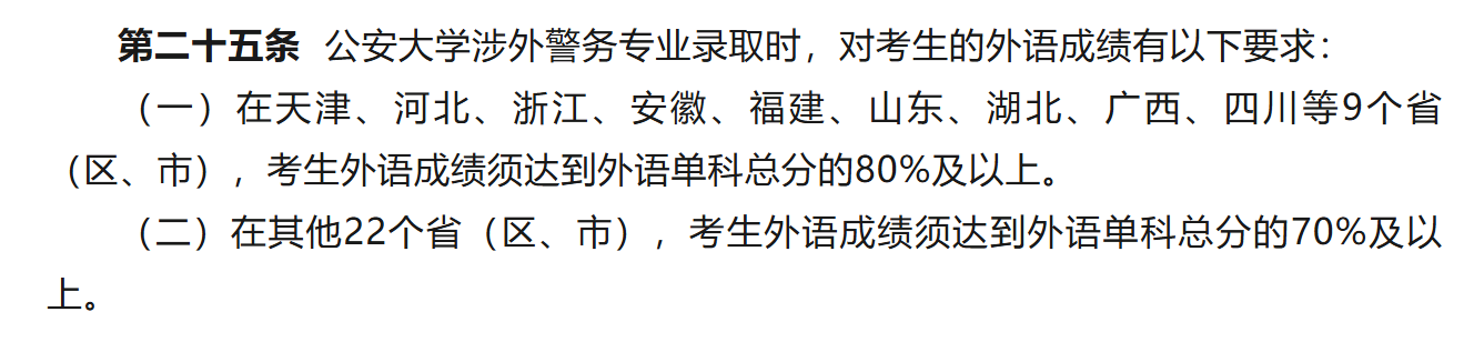 如果大家报考的是涉外警务专业,学校也对外语成绩有要求,具体如下图所示。不同警校特殊专业的要求有一定差异,填报志愿的时候一定要仔细查阅学校的招生章程。