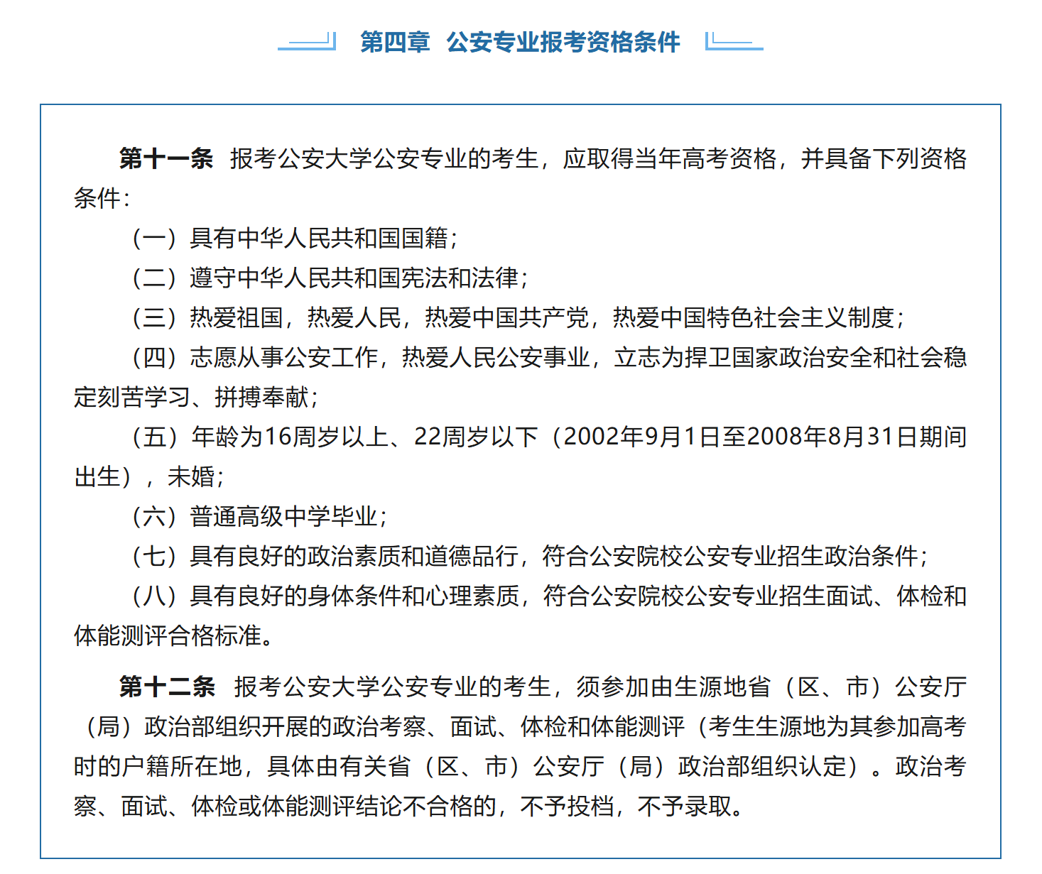 公安专业毕业后可以参加公安联考,然后通过选岗的方式入警入编,所以它的招生要求比较严苛。以中国人民公安大学2024年最新招生章程,报考要求如下图。概括来看主要是三大条件: