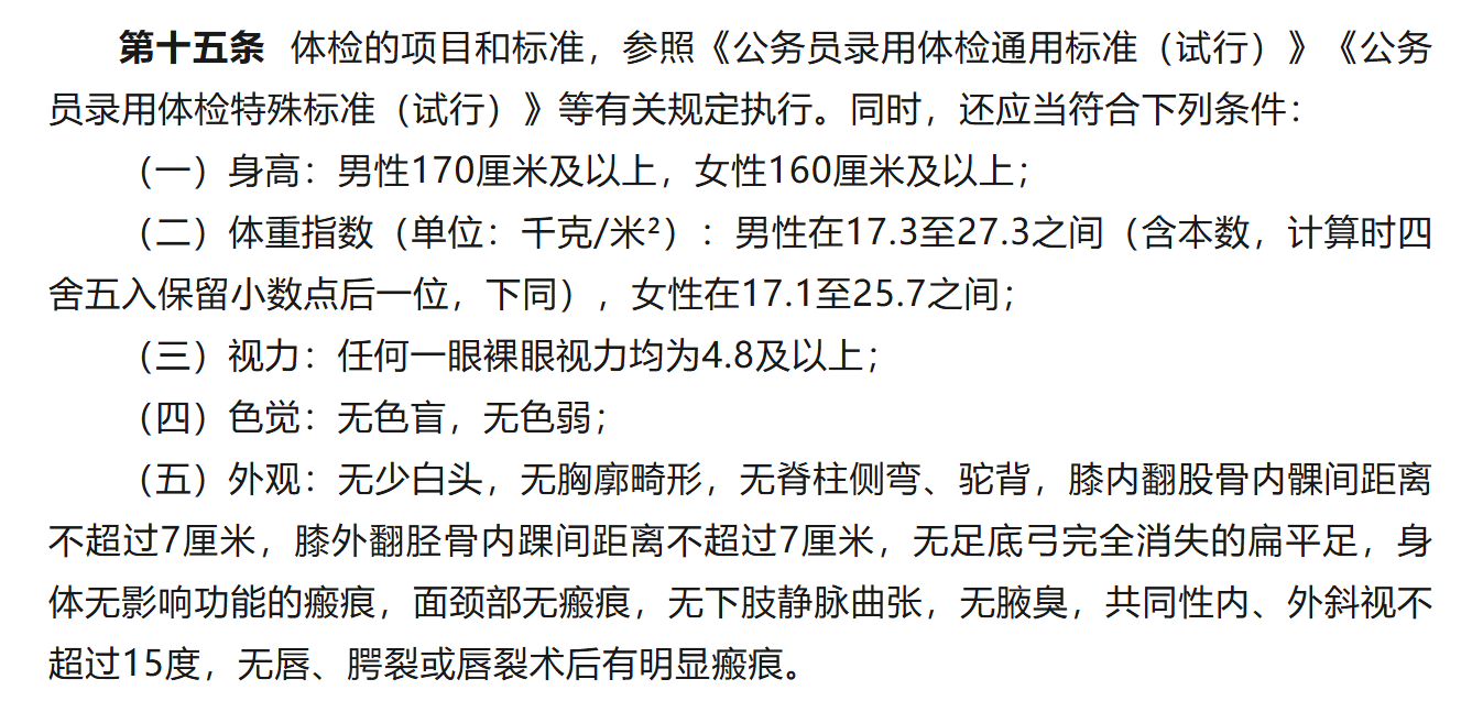 除了以上报考条件外,警校的体检也比较严格,它参考的是公务员的考察办法,对身高、体重、色觉等方面都有要求。