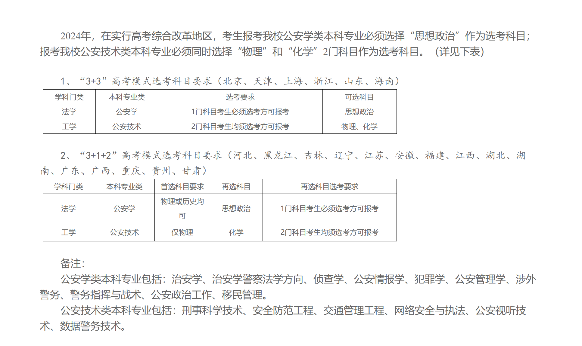 以中国人民公安大学为例,警校公安类专业选科要求如下图所示。公安类专业分两类,即公安学和公安技术专业,前者属于法学学科,后者为工学学科下专业。公安学专业要求政治必选,公安技术专业要求物理和化学必选。