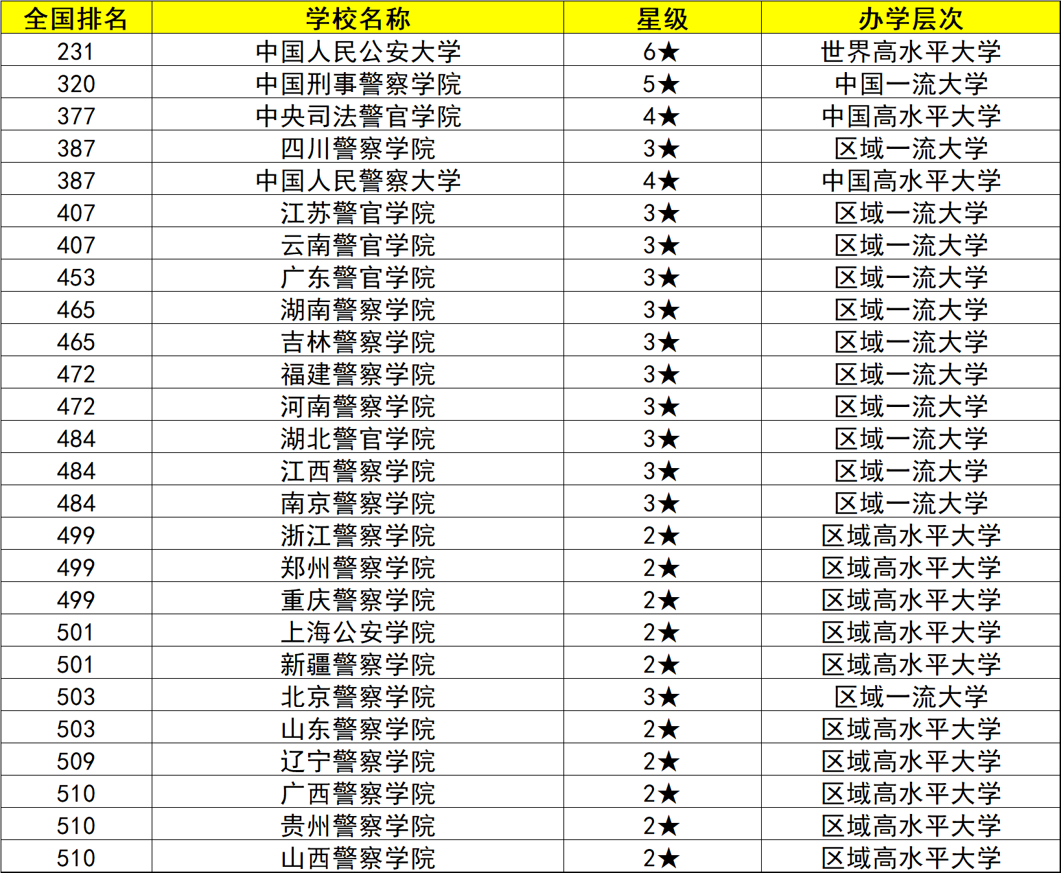 警校中没有985、211大学,唯一一所双一流高校为中国人民公安大学。下方是警校最新的排名情况。