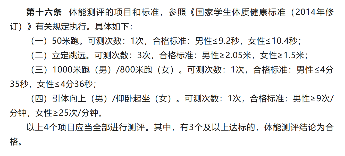 报考警校还要通过学校组织的体能测试,因为警察工作强度高,对体力要求也高。体能测试标准如下。以下考核项目只要有三个符合标准,该项测试即算通过。