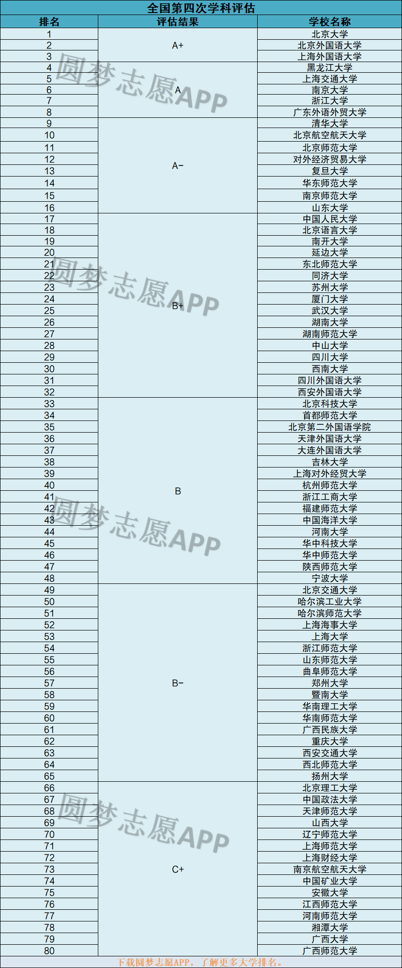 经过全国第四次学科评估,教育部给出了外国语言进行了等级划分,其中英语专业就是其中一类。老师整理成表格,供大家参考,如下所示: