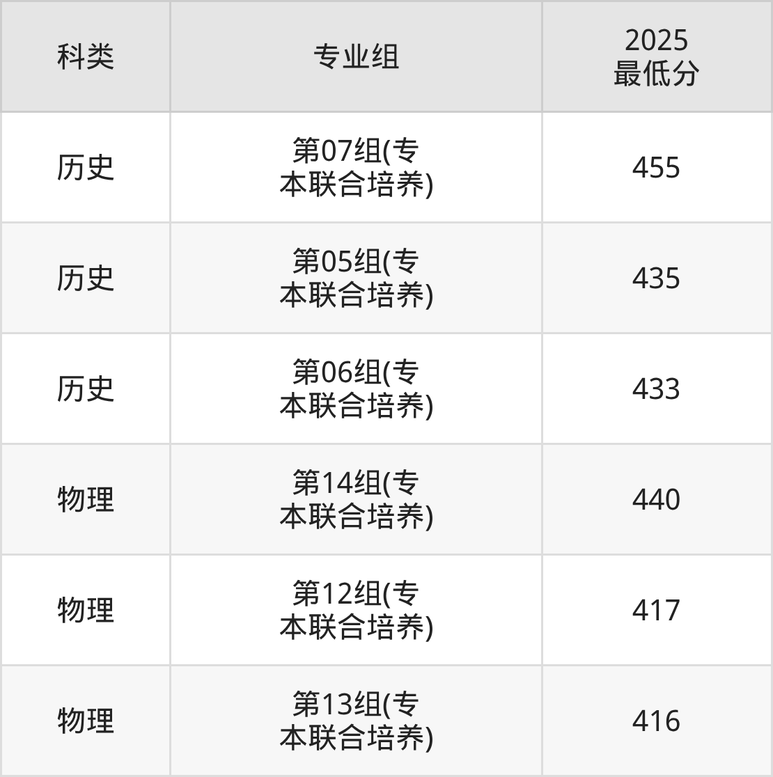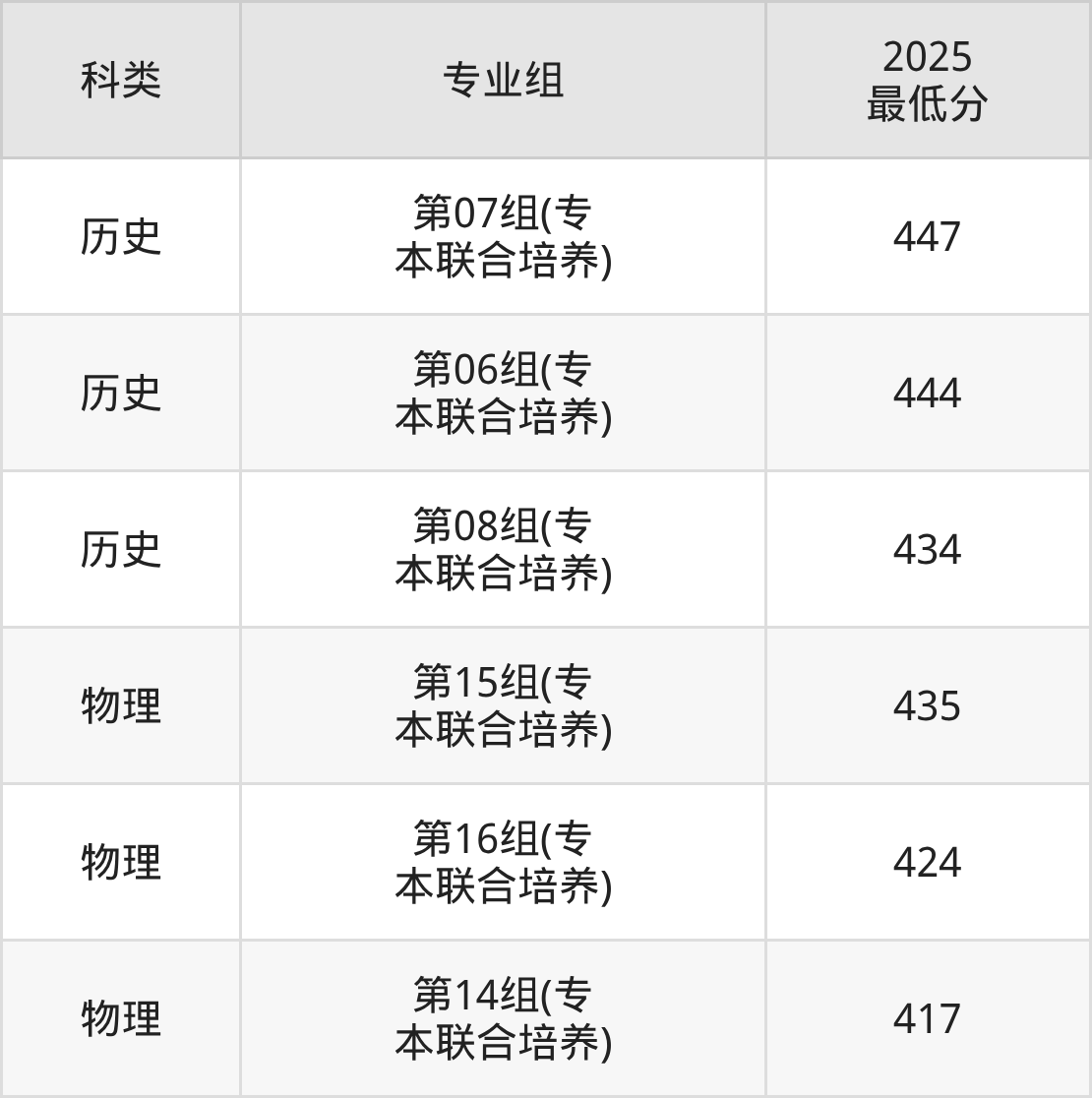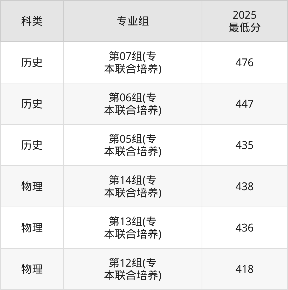 下面是各专业组最低分: