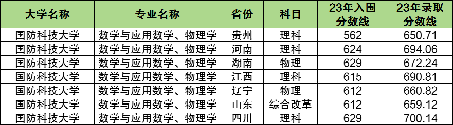 以下会介绍国防科技大学在贵州、河南、湖南、江西、辽宁、山东、四川的入围分数线及录取分数划线。