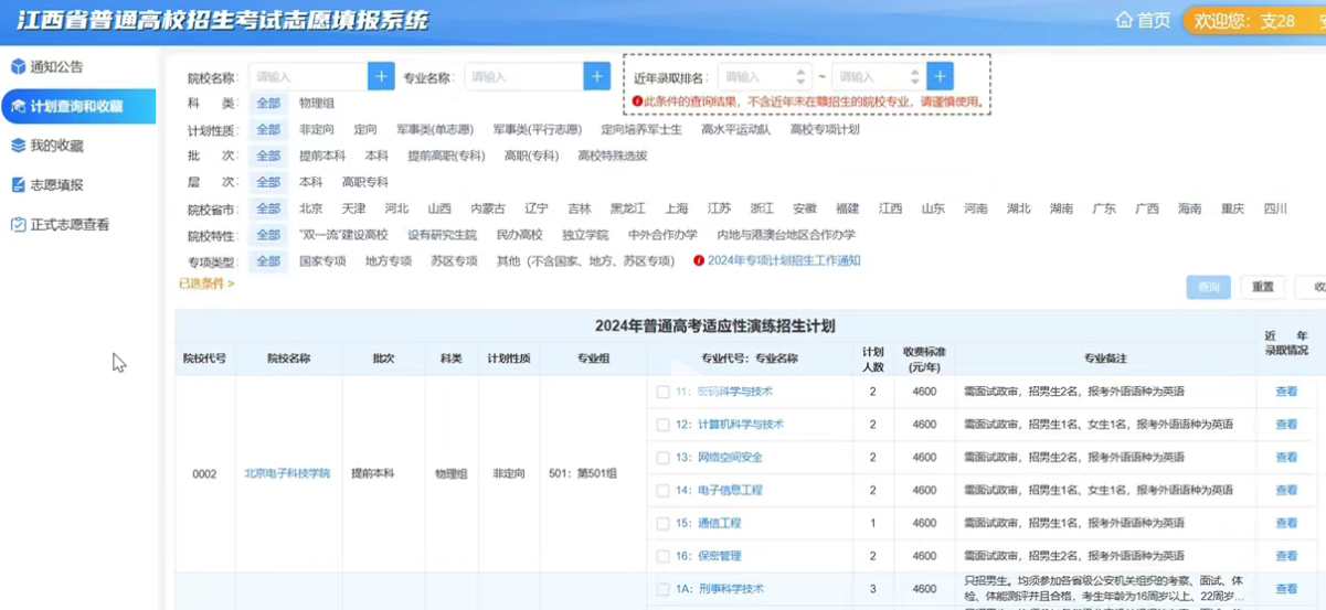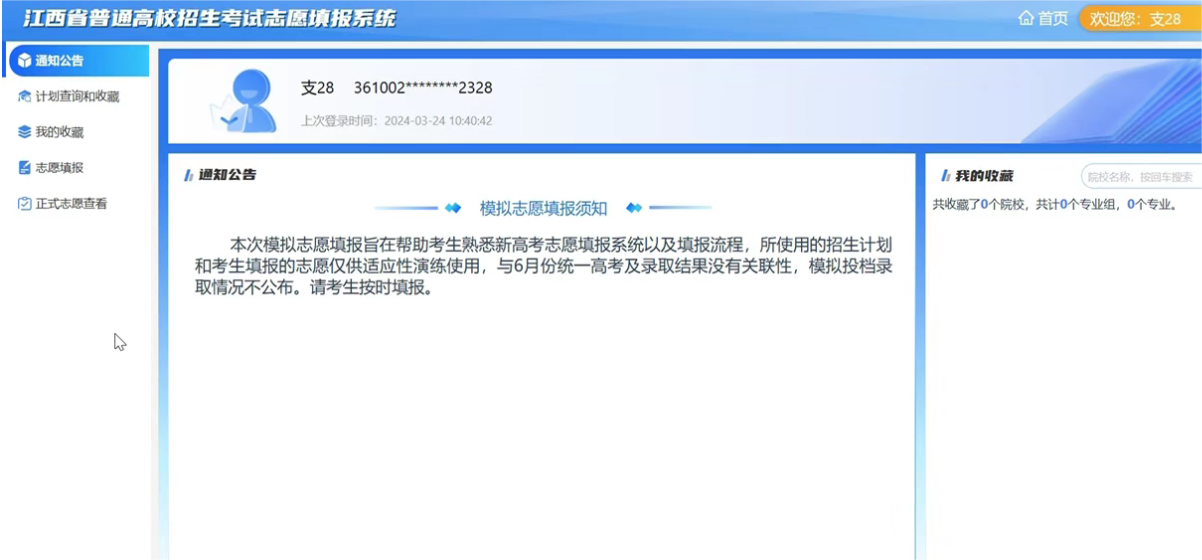 本次模拟志愿填报使用江西省2024年普通高校招生真实计划,考生在系统填报的所有数据将在本次模拟填报结束后清空,不作为考生正式填报志愿。