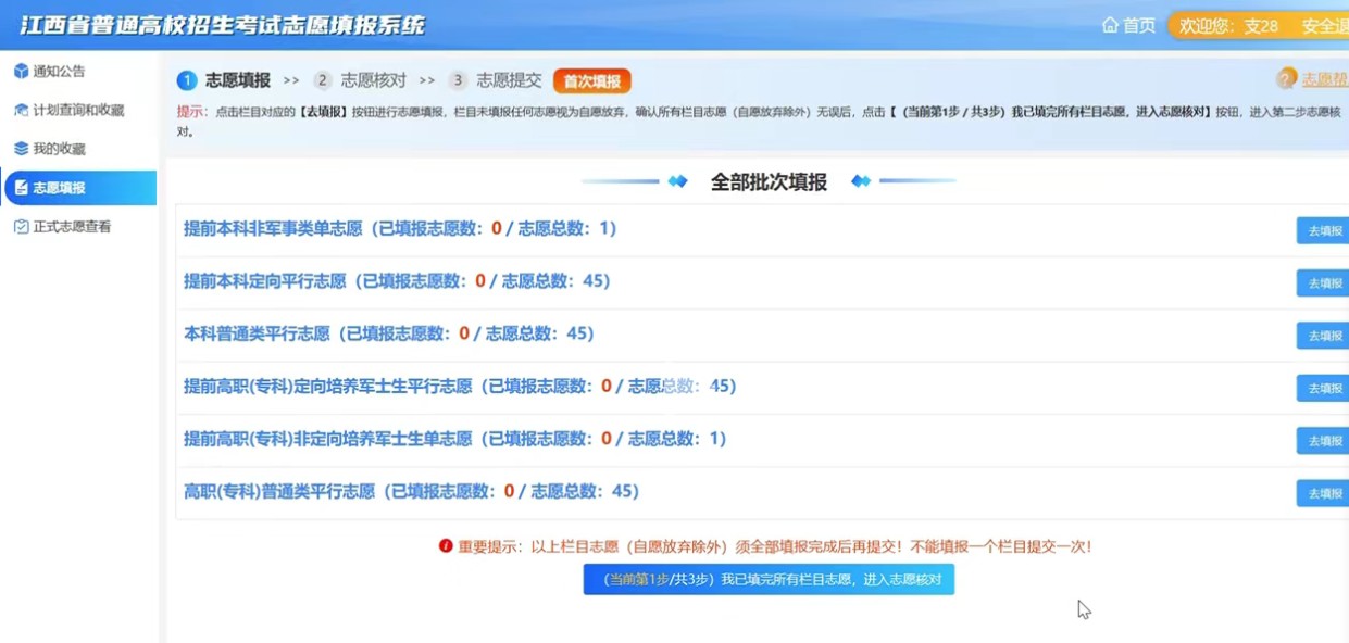 志愿填报分为上下两个部分,上面部分为填报导航信息区域,下面部分为填报操作区域,在操作区域可查询自己可填报的所有批次栏目,考生点击对应的去填报按钮,则会弹出该栏目填报界面。