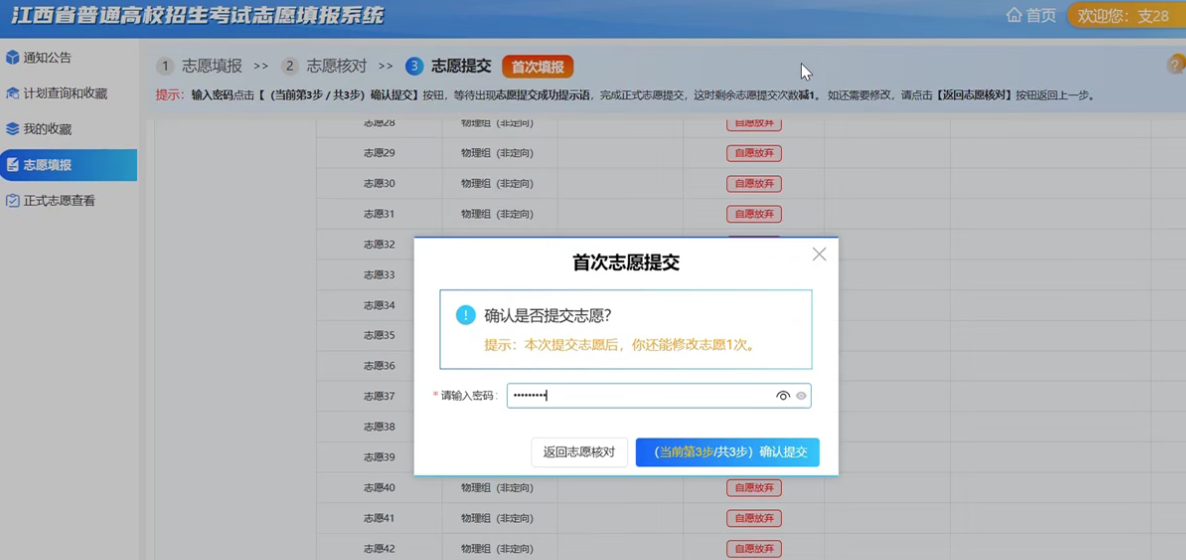 考生在完成所有批次栏目的填报后,需要对志愿填报进行确认,然后进行志愿提交,在志愿提交界面输入密码,就完成了正式志愿填报。