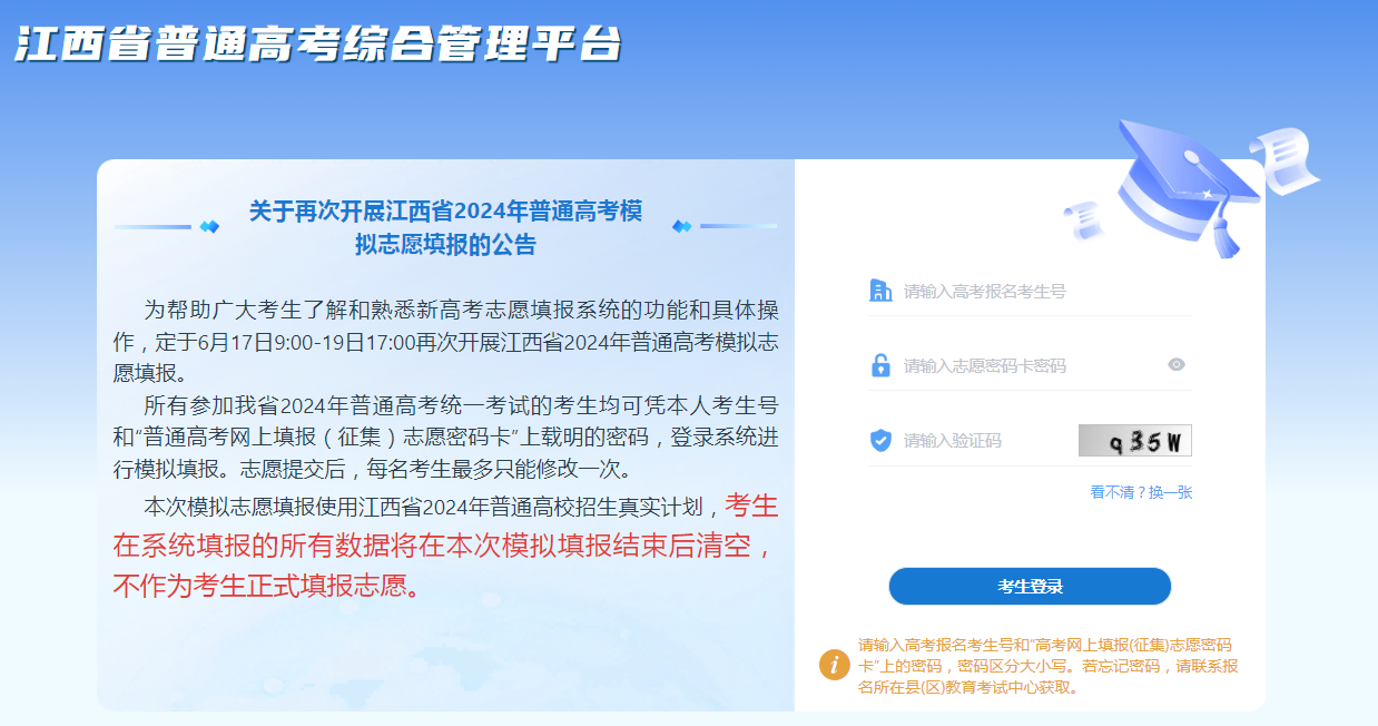 考生均可凭本人考生号和“普通高考网上填报(征集)志愿密码卡”上载明的密码,登录“江西省2024年普通高考模拟志愿填报系统”进行模拟填报,志愿提交后,每名考生最多只能修改一次。