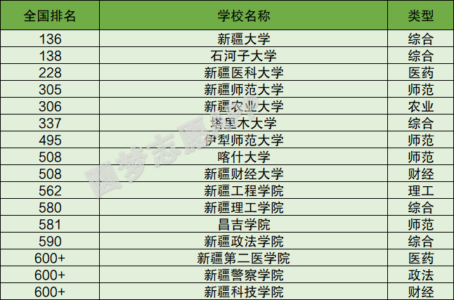 根据教育部公布的最新全国大学名单可知,新疆维吾尔自治区共有62所大学,其中新疆公办本科大学有17所、新疆民办本科大学有2所、新疆公办专科大学39所、新疆民办专科大学4所。