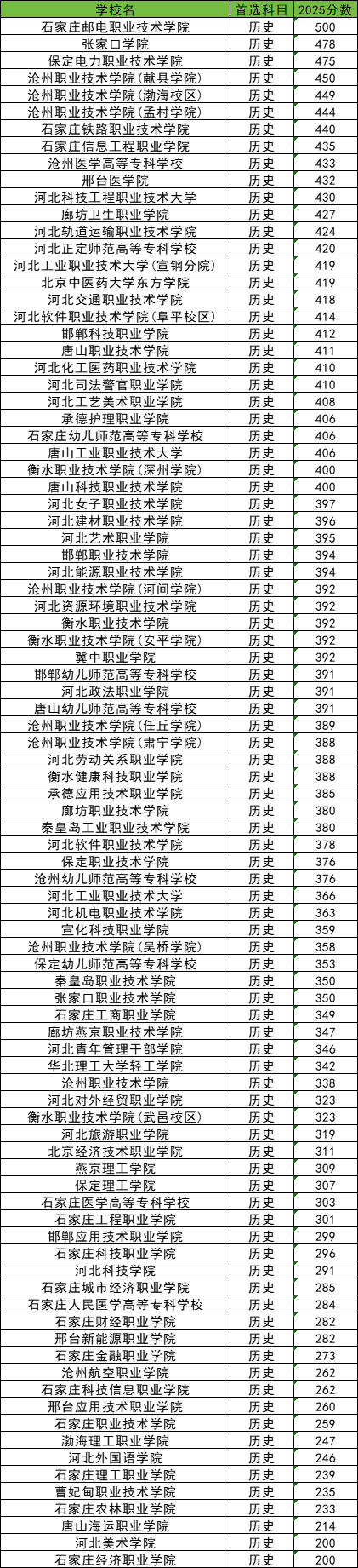 下面是2025年河北省内专科高校历史类录取分数线一览表: