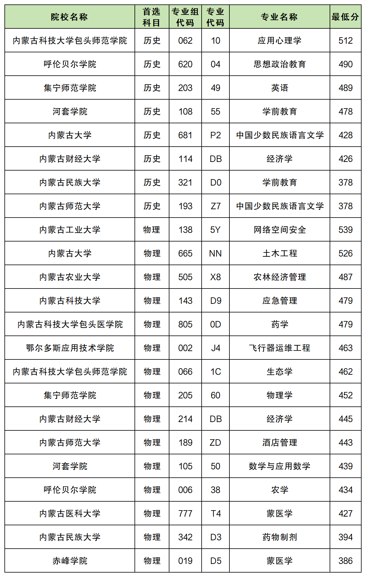 物理类:各校最低录取分数在386分-539分,最低分对应赤峰学院,最高分对应内蒙古工业大学。