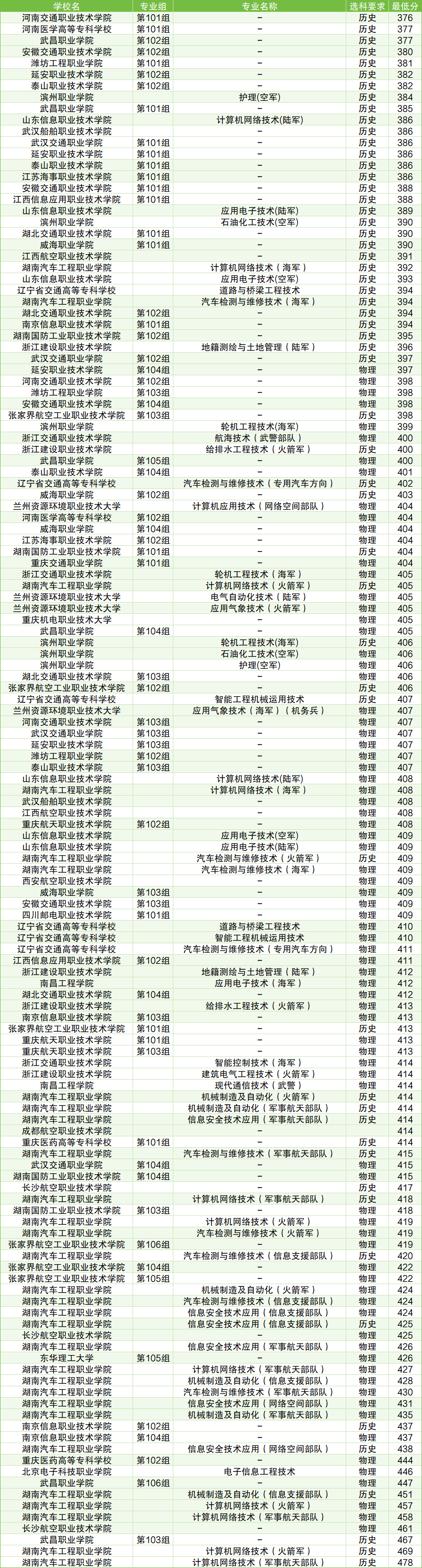 湖南汽车工程职业学院历史类计算机网络技术(军事航天部队)(478分)、湖南汽车工程职业学院历史类计算机网络技术(火箭军)(469分)、武昌职业学院历史类第103组(467分)、湖南汽车工程职业学院物理类计算机网络技术(火箭军)(457分)。